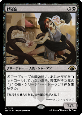 各アップキープの開始時に、あなたが蛇(Snake)をコントロールしていない場合、接死を持つ黒の1/1の蛇クリーチャー・トークンを1体生成する。2/2