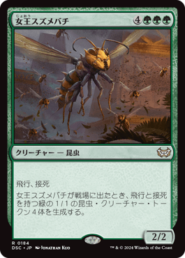 女王スズメバチが戦場に出たとき、飛行と接死を持つ緑の1/1の昆虫(Insect)クリーチャー・トークン4体を生成する。2/2