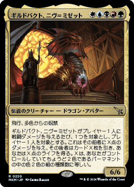 ギルドパクト、ニヴ=ミゼットがプレイヤー1人に戦闘ダメージを与えるたび、1つを対象とし、プレイヤー1人を対象とする。これはその前者にX点のダメージを与え、その後者はカードX枚を引き、あなたはX点のライフを得る。Xは、あなたがコントロールしていてちょうど2色であるパーマネントの中の色2色の組の種類数に等しい。6/6