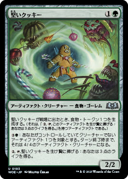堅いクッキーが戦場に出たとき、食物(Food)トークン1つを生成する。(それは、「(2),(T),このアーティファクトを生け贄に捧げる:あなたは3点のライフを得る。」を持つアーティファクトである。)