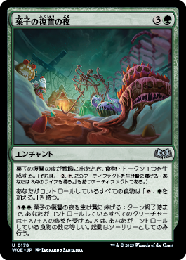 菓子の復讐の夜が戦場に出たとき、食物(Food)トークン1つを生成する。(それは、「(2),(T),このアーティファクトを生け贄に捧げる:あなたは3点のライフを得る。」を持つアーティファクトである。)