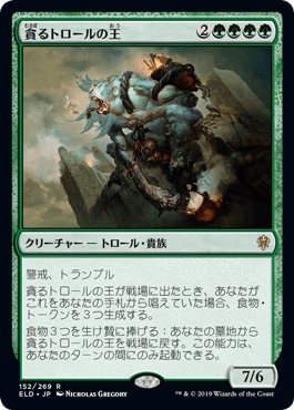 貪るトロールの王が戦場に出たとき、あなたがこれをあなたの手札から唱えていた場合、食物(Food)トークンを3つ生成する。