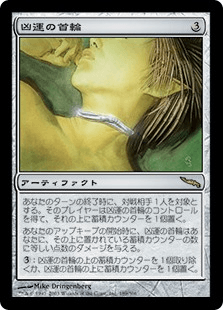あなたのアップキープの開始時に、凶運の首輪はその上に置かれている蓄積カウンターに等しい点数のダメージをあなたに与える。