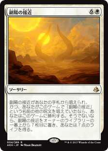 この呪文があなたの手札から唱えられ、かつ、あなたがこのゲームで《副陽の接近/Approach of the Second Sun》という名前の他の呪文を唱えていたなら、あなたはこのゲームに勝利する。そうでないなら、副陽の接近をオーナーのライブラリーの一番上から7枚目に置き、あなたは7点のライフを得る。