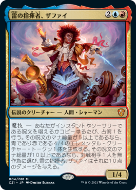 魔技 ― あなたがインスタントやソーサリーである呪文を唱えるかコピーするたび、占術1を行う。その呪文のマナ総量が5以上であるなら、青赤の4/4のエレメンタル(Elemental)・クリーチャー・トークン1体を生成する。その呪文のマナ総量が10以上であるなら、対戦相手1人を無作為に選び、雷の指揮者、ザファイはそれに10点のダメージを与える。1/4