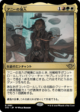 アニーの加入が戦場に出たとき、対戦相手がコントロールしていてクリーチャーやプレインズウォーカーである1体を対象とする。これはそれに5点のダメージを与える。