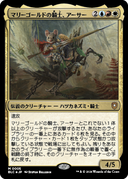 マリーゴールドの騎士、アーサーとこれでない1体以上のクリーチャーが攻撃するたび、あなたのライブラリーの一番上にあるカード6枚を見る。その中からクリーチャー・カード1枚をタップ状態かつ攻撃している状態で戦場に出してもよい。残りをあなたのライブラリーの一番下に無作為の順番で置く。戦闘の終了時に、そのクリーチャーをオーナーの手札に戻す。4/5