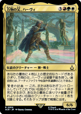 あなたの墓地に4枚以上の歴史的なカードがあるかぎり、万物の父、ハーヴィは破壊不能を持つ。(歴史的とは、アーティファクトや伝説や英雄譚(Saga)のことである。)