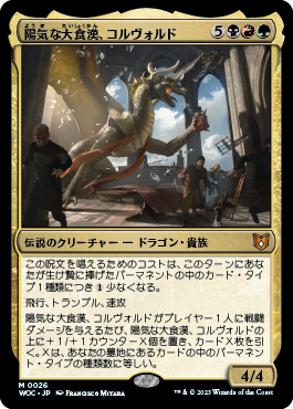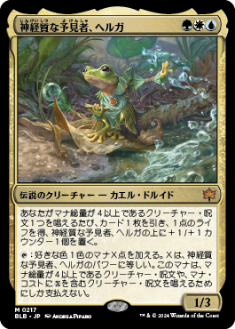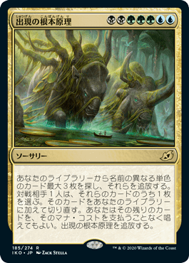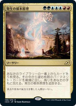 あなたの戦闘前メイン・フェイズの開始時に、あなたのライブラリーの一番上にあるカード1枚を見る。そのカードのマナ・コストに3つ以上の色マナ・シンボルがあるなら、あなたはそれを公開してもよい。そうしたなら、それの色であるマナを望む組み合わせで合計3点加え、それをあなたの手札に加える。それを公開しないなら、それをあなたの手札に加える。4/4