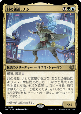 月の後裔、ナシが攻撃するたび、あなたの墓地にありネズミ(Rat)や伝説であるカードのうち最大1枚を対象とする。それを追放し、コピーする。あなたはそのコピーを唱えてもよい。(そのコストは支払う必要がある。パーマネント呪文のコピーはトークンになる。)3/4