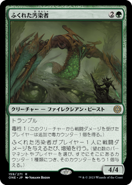 ふくれた汚染者がプレイヤー1人に戦闘ダメージを与えるたび、増殖を行う。(望む数のパーマネントやプレイヤーを選び、すでにそこにあるカウンター1種類につき、そのカウンターをもう1個与える。)4/4