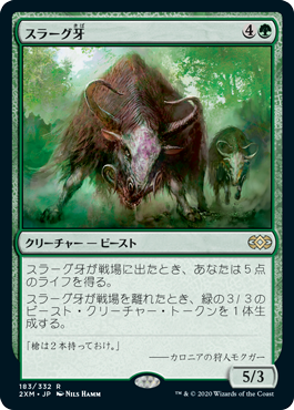 スラーグ牙が戦場を離れたとき、緑の3/3のビースト(Beast)・クリーチャー・トークンを1体生成する。5/3