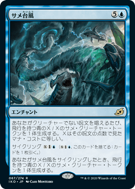 あなたがサメ台風をサイクリングしたとき、飛行を持つ青のX/Xのサメ・クリーチャー・トークン1体を生成する。