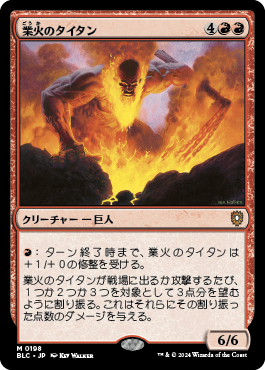 業火のタイタンが戦場に出るか攻撃するたび、クリーチャーかプレインズウォーカーかプレイヤーの組み合わせを1つまたは2つまたは3つ対象とする。業火のタイタンはそれらに、3点のダメージを望むように割り振って与える。6/6