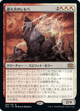 あなたが赤の呪文を唱えるたび、プレイヤー1人かプレインズウォーカー1体を対象とする。迎え火のしもべはそのプレイヤーに3点のダメージを与える。