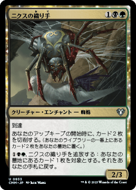 (1)(黒)(緑),ニクスの織り手を追放する:あなたの墓地にあるカード1枚を対象とし、それをあなたの手札に戻す。2/3