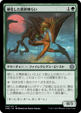 硬化した屑鉄喰らいがタップ状態になるたび、墓地にあるカード1枚を対象とする。それを追放し、硬化した屑鉄喰らいの上に油カウンター1個を置く。0/3