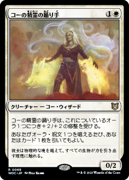 コーの精霊の踊り手は、それにつけられているオーラ(Aura)1つにつき+2/+2の修整を受ける。