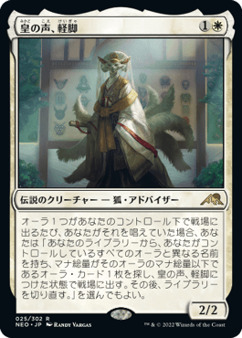 オーラ(Aura)1つがあなたのコントロール下で戦場に出るたび、あなたがそれを唱えていた場合、あなたは「あなたのライブラリーから、あなたがコントロールしているすべてのオーラと異なる名前を持ち、マナ総量がそのオーラのマナ総量以下であるオーラ・カード1枚を探し、皇の声、軽脚につけた状態で戦場に出す。その後、ライブラリーを切り直す。」を選んでもよい。2/2