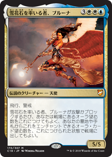 雪花石を率いる者、ブルーナが攻撃かブロックするたび、あなたは戦場に出ているオーラ(Aura)を望む数だけ選び、それらをこれにつけてもよい。また、あなたの墓地や手札にある、これにエンチャントできるオーラ・カードを望む数だけ選び、それらをこれにつけた状態で戦場に出してもよい。5/5
