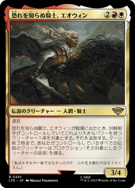 恐れを知らぬ騎士、エオウィンが戦場に出たとき、対戦相手がコントロールしていてこれより大きなパワーを持つクリーチャー1体を対象とする。それを追放する。ターン終了時まで、あなたがコントロールしているすべての伝説のクリーチャーはプロテクション(その対象としたクリーチャーの各色)を得る。3/4