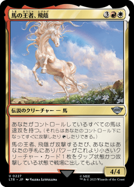 馬の王者、飛蔭が攻撃するたび、あなたはあなたの手札にありパワーがこれより小さいクリーチャー・カード1枚をタップ状態かつ攻撃している状態で戦場に出してもよい。4/4
