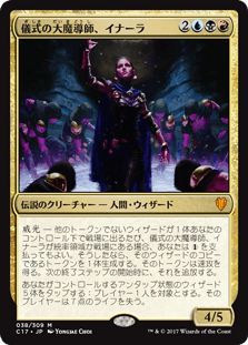威光 ― 他のトークンでないウィザード(Wizard)が1体あなたのコントロール下で戦場に出るたび、儀式の大魔導師、イナーラが統率領域か戦場にある場合、あなたは(1)を支払ってもよい。そうしたなら、そのウィザードのコピーであるトークンを1体生成する。そのトークンは速攻を得る。次の終了ステップの開始時に、それを追放する。