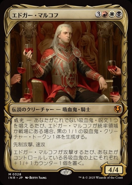 威光 ― あなたが他の吸血鬼(Vampire)呪文を1つ唱えるたび、エドガー・マルコフが統率領域か戦場にある場合、黒の1/1の吸血鬼クリーチャー・トークンを1体生成する。