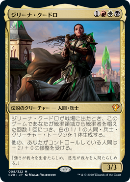 ジリーナ・クードロが戦場に出たとき、このゲームであなたが統率領域から統率者を唱えた回数1回につき、白の1/1の人間(Human)・兵士(Soldier)クリーチャー・トークンを1体生成する。