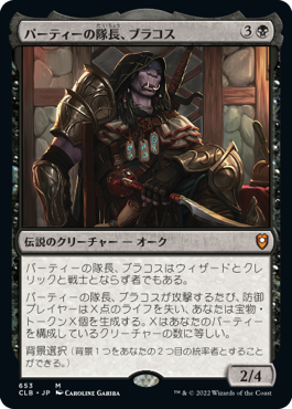 パーティーの隊長、ブラコスが攻撃するたび、防御プレイヤーはX点のライフを失い、あなたは宝物(Treasure)トークンX個を生成する。Xは、あなたのパーティーを構成しているクリーチャーの数に等しい。