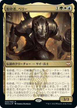 粉砕者、ペリーが攻撃するたび、あなたがコントロールしているクリーチャー1体を対象とする。ターン終了時まで、それはトランプルを得て+X/+Xの修整を受ける。Xは、あなたがコントロールしているすべてのパーマネントの中のカウンターの種類数に等しい。3/3